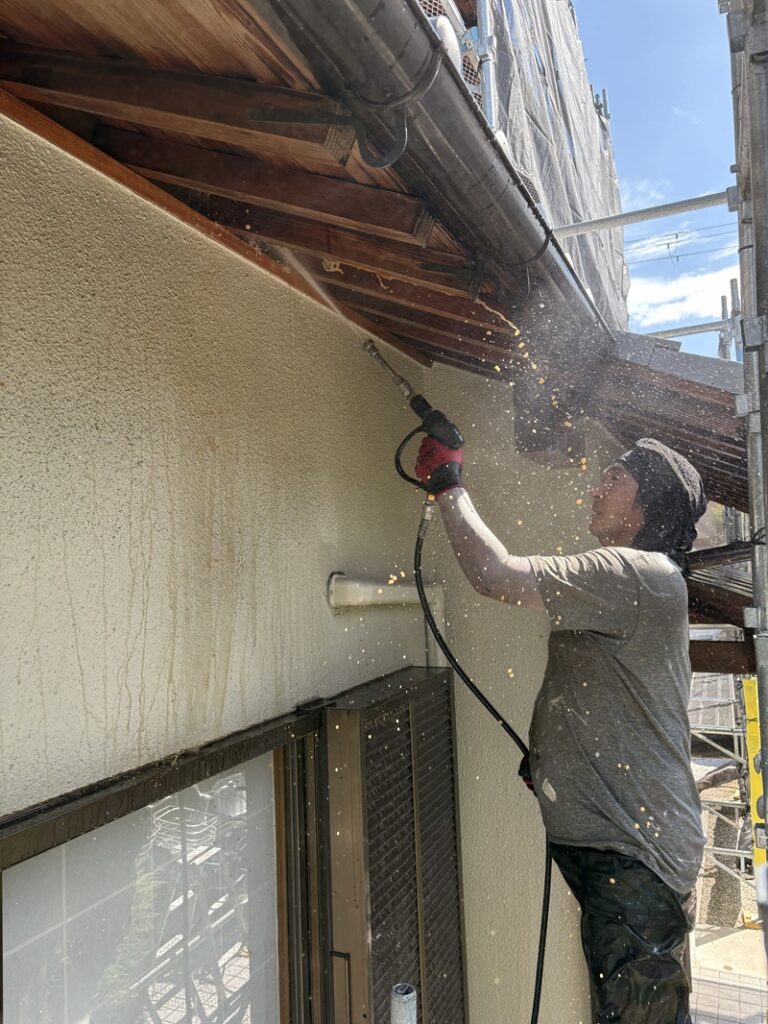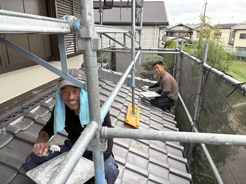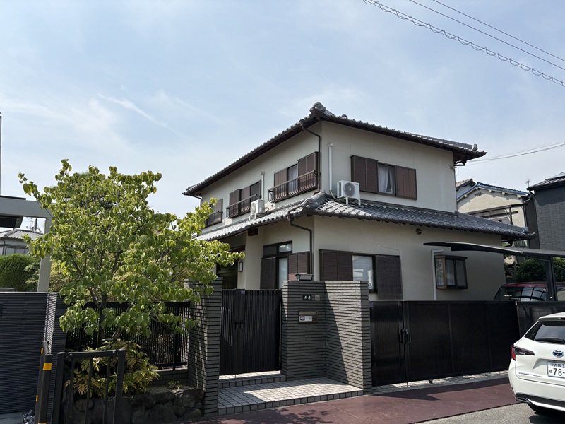 今回のお客様のご要望は、13年前にもほりてつで施工させていただきまして、定期点検にお伺いさせていただきましたところ、外壁のひび割れと、瓦の割れやしっくいの劣化でした。点検させて頂きましたところ、瓦の割れは、無く瓦のしっくいもところどころ、劣化して来ており、外壁は、ひび割れや、汚れ、手に白いチョ-ク状の汚れが付く状態でした。