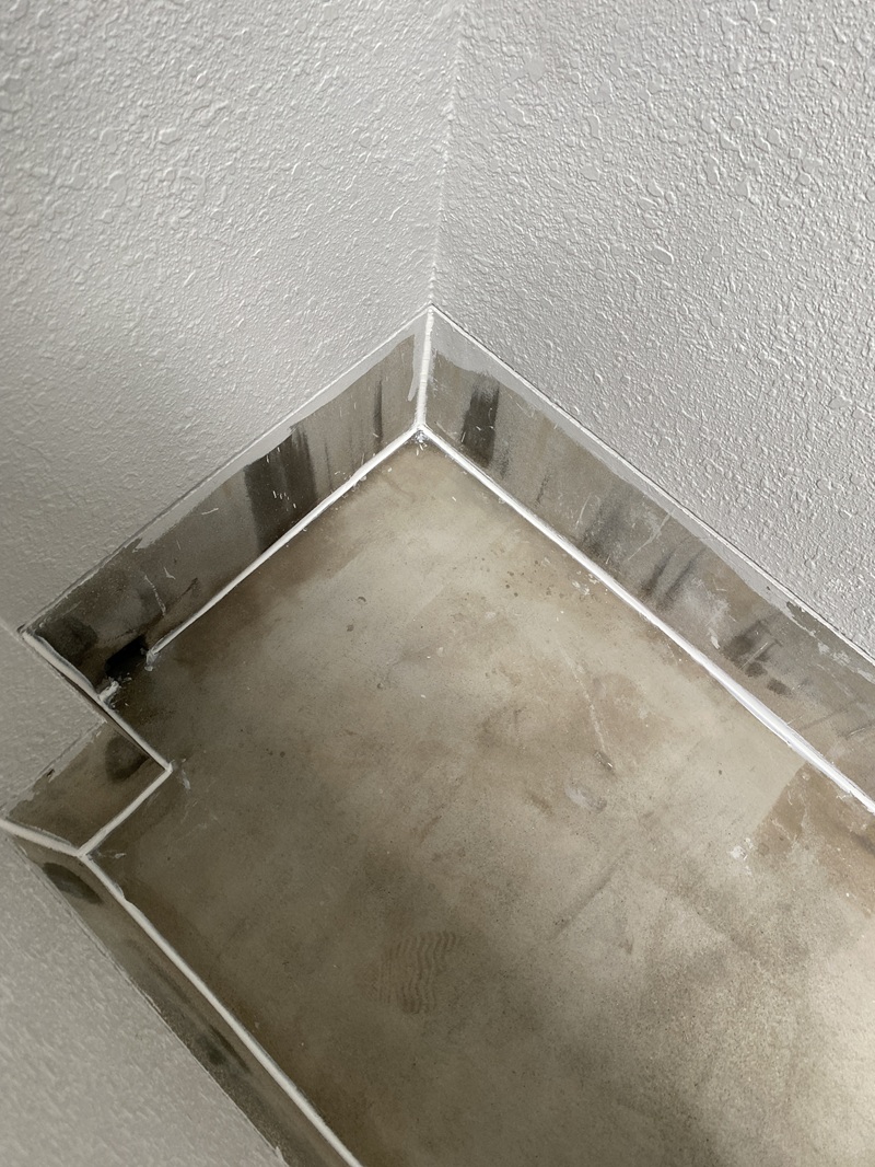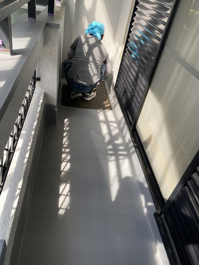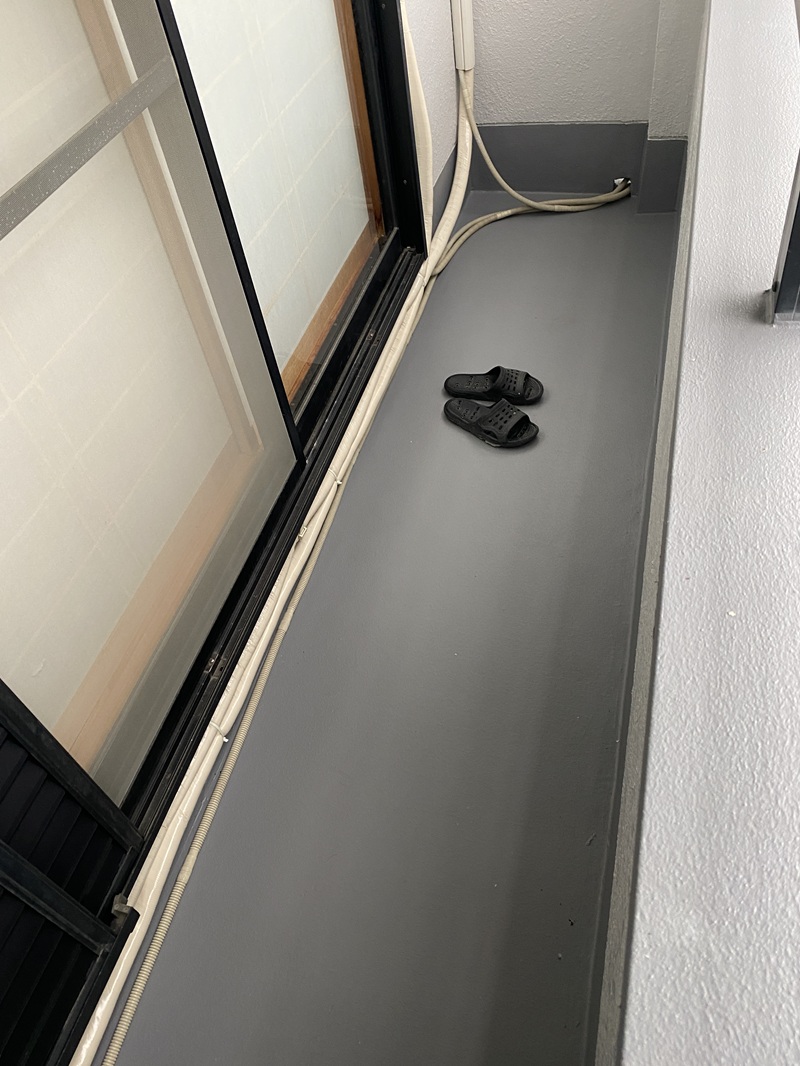 防水工事ですが、天井もあり傷みが少なく、劣化や紫外線も風化しにくいと考えまして、エクセルテックスのカチオン系の防水仕様でさせていただきました。ウレタン防水に比べかなりお安く施工できます。